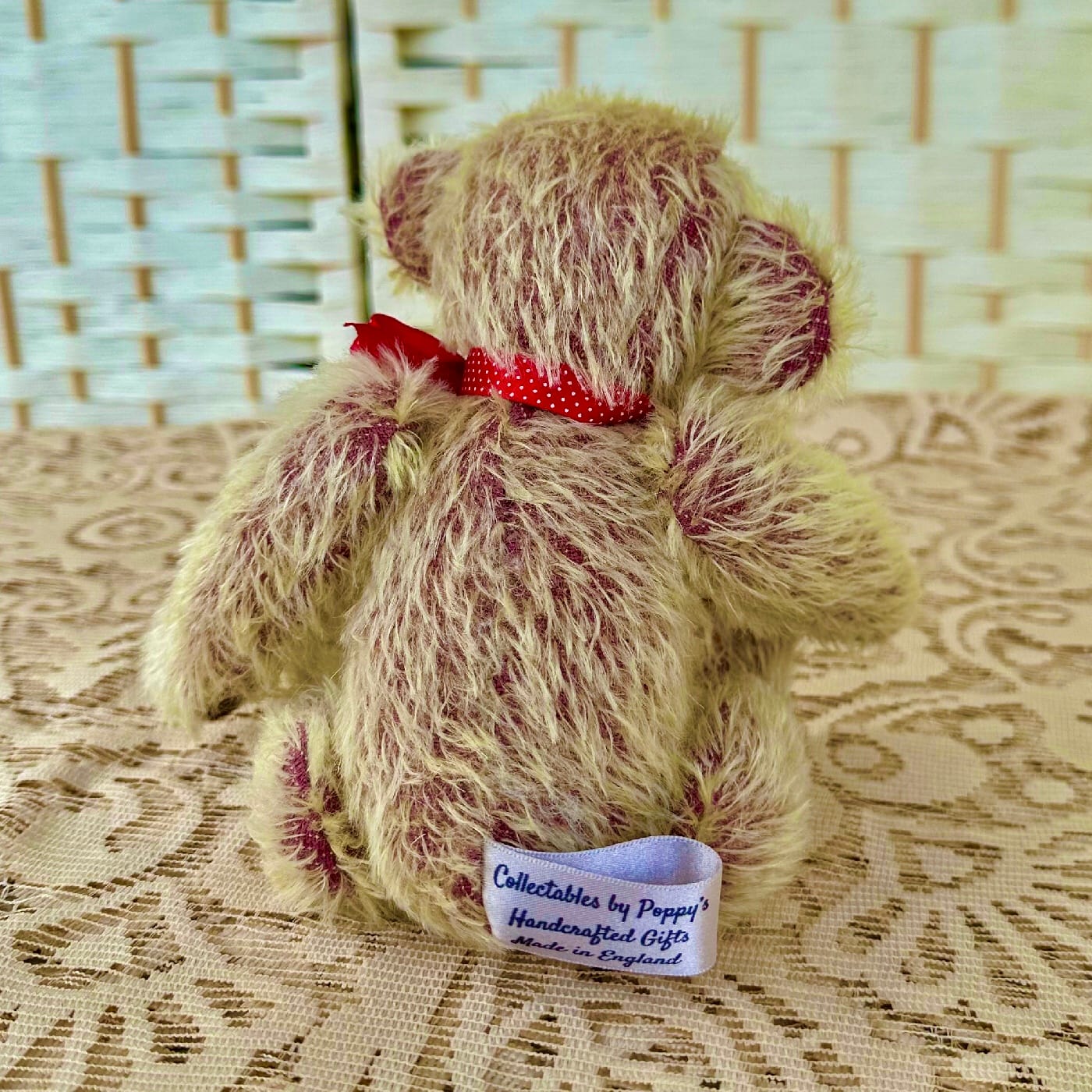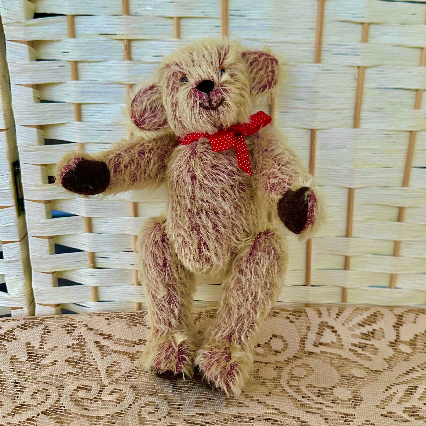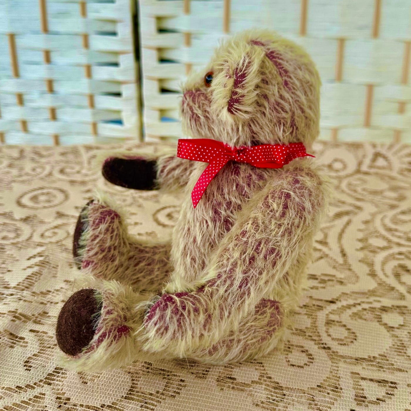 Traditionally made in 12mm Gold on Raspberry Sparse Mohair with 100% wool felt pads and paws, using cotter pin joints, glass eyes, and medium weighted bottom. He prefers to be sitting, and will not stand without propping or using a doll stand.