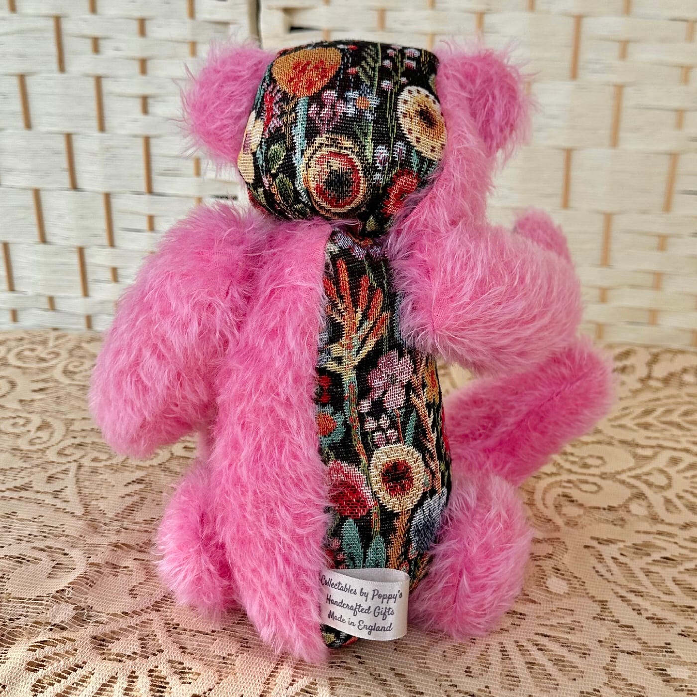 Made in 15mm Bubblegum Pink Schulte Mohair and Floral Tapestry fabric. Traditionally made using cotter pin joints, glass eyes, and medium weighted bottom. She is made as a sitting Bear, and will not stand without propping or using a doll stand.