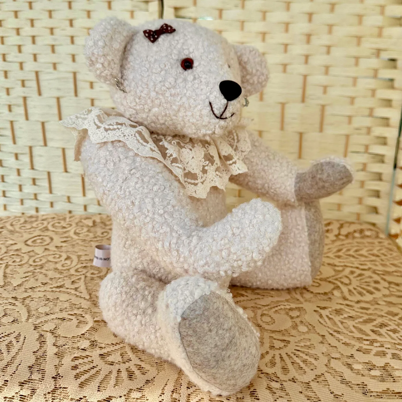 CARE: It is advisable not to display your bear in direct sunlight. Do not immerse in water, should it get an accidental mark, then lighly dab with a moist (not wet) soft cloth.